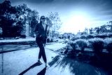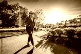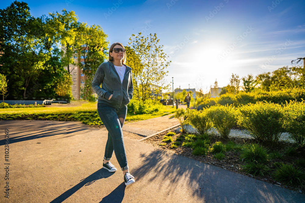 Mature woman walking in city park on sunny spring day. City park at golden hour. Walking and relaxing