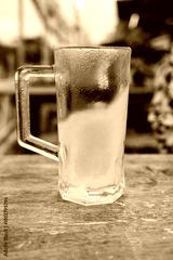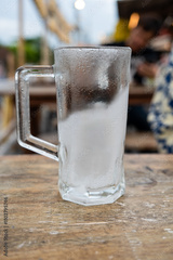 Empty beer mug covered with frost on wood table