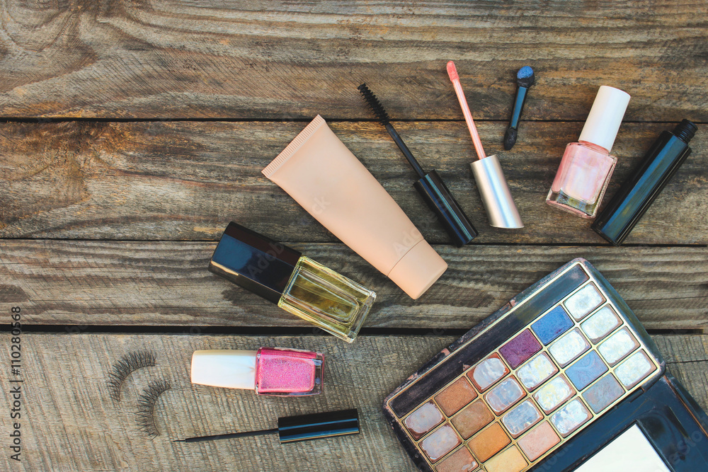 Cosmetics: mascara, eyeliner, false eyelashes, concealer, nail polish, perfume, lip gloss and eye shadow on wooden background. Toned image.