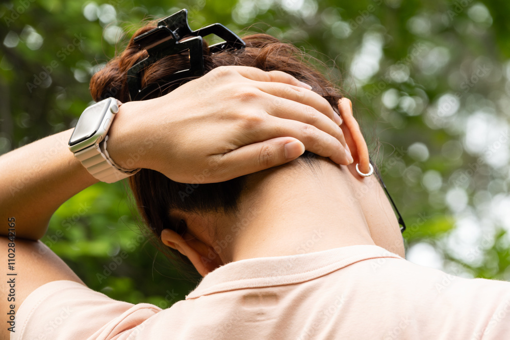 The woman had neck pain, shoulder pain, and Cervical Spondylosis sHe used her hands to massage the pain points of the muscles in her shoulders and neck. Medical concepts and treatments