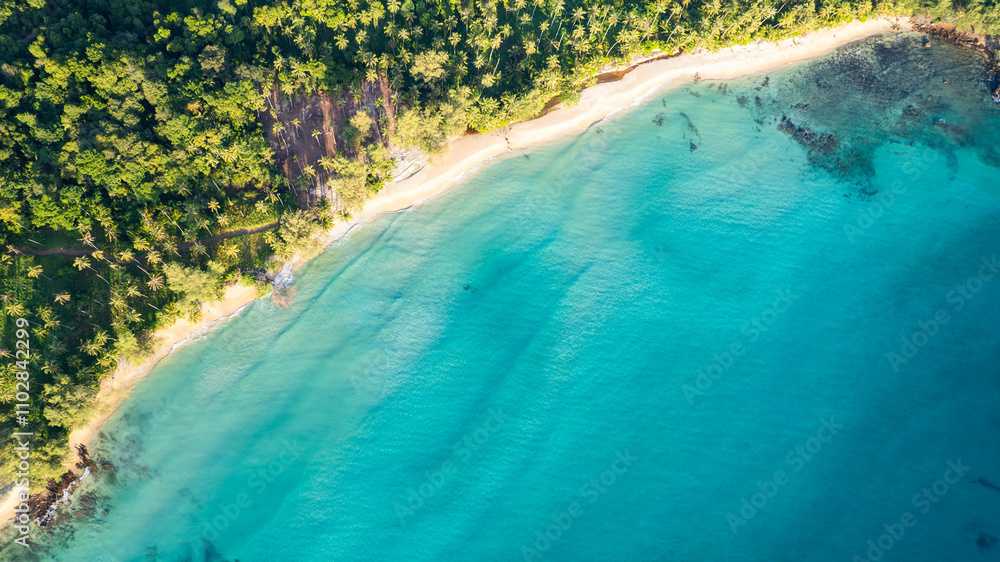 Top view of the dark green forest and the sea. Natural ecosystems of forests and oceans. concept of natural forest conservation