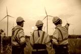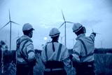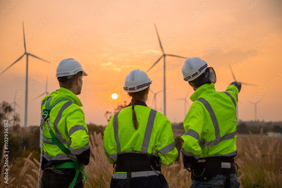 Back view, Team engineer wearing safety uniform discussed plan about renewable energy at station energy power wind in evening when sunset. Technology environment reduce global warming problems.