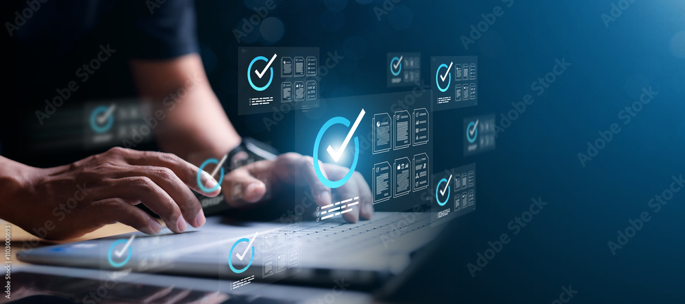 Businessman Take an assessment, Check list, questionnaire, evaluation, filling out an online survey form. Answer the test questions. online survey exam Choosing the right answer in the exam,