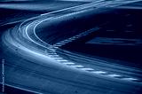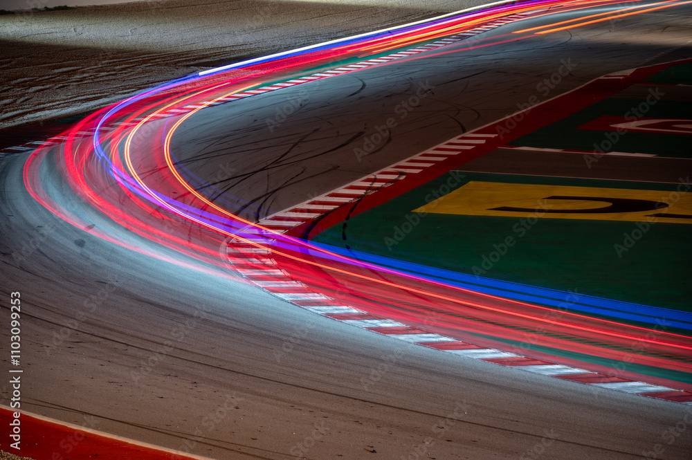 Detail of the traces of light left by the racing cars as they pass through the curve of the circuit during the 24 hours of endurance. Long exposure photography with red and blue light trails