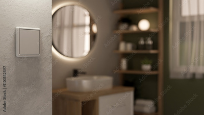 A close-up of a light switch on a white wall, with a blurred modern bathroom in the background.