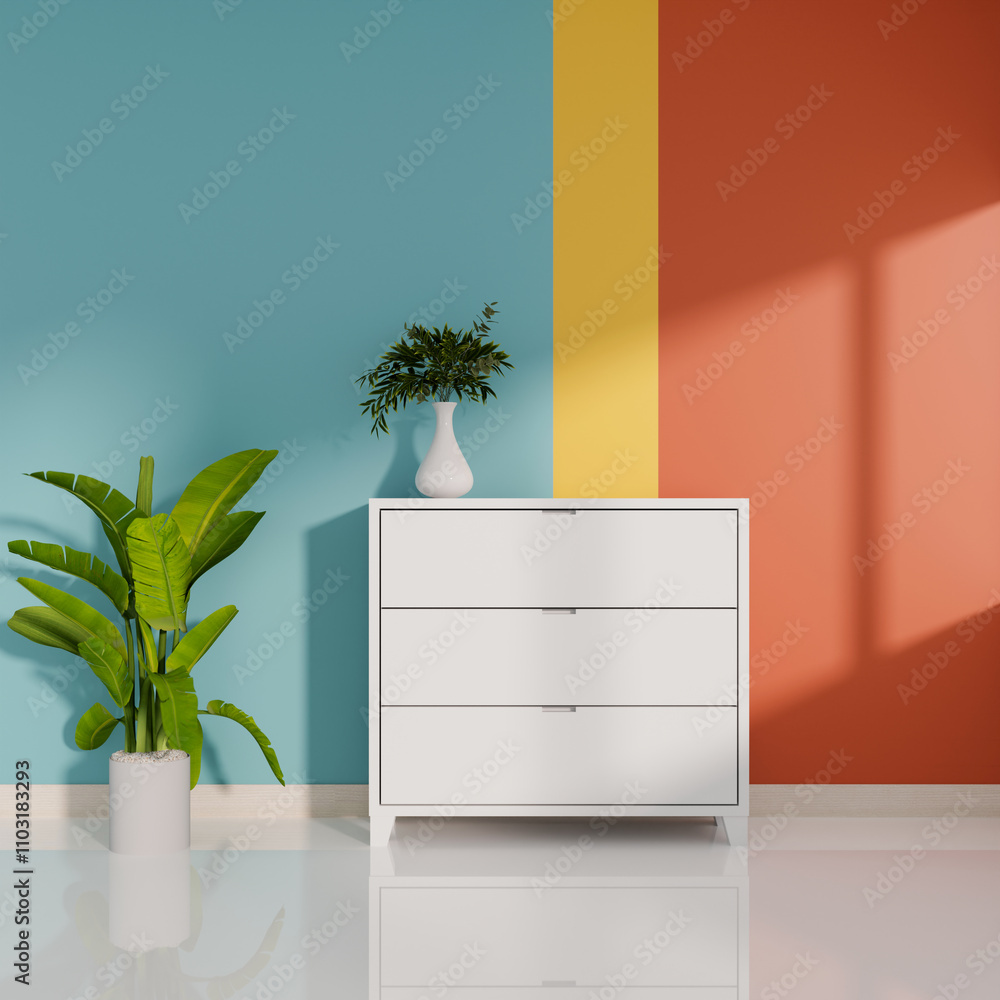 A trendy colorful room features a minimal white drawer, decorative plants, and a white tiled floor.