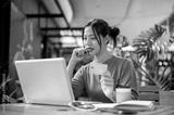 A charming, happy Asian woman is paying bills online or shopping online through her laptop.