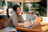 A beautiful Asian woman is taking notes in a book while talking on the phone, working remotely.