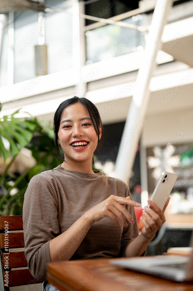 A smiling Asian woman sits at an outdoor table of a cafe in the city with a smartphone in her hand.