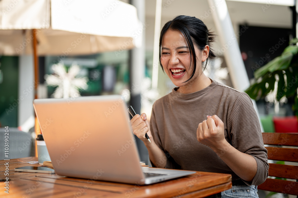 A woman sits in front of her laptop outdoors, celebrating her success with an excited scream of joy.