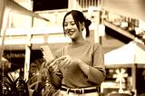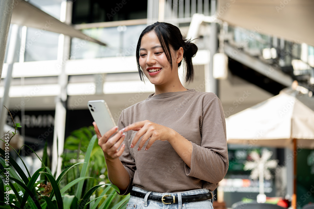 A cheerful Asian woman uses her smartphone, reads text on the phone while walking outdoors.