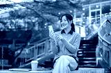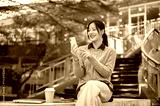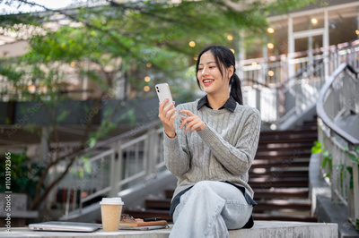 A beautiful, happy Asian woman sits outdoors on a bright day, using her smartphone with a smile.