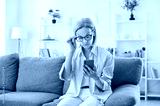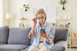 Old woman is enjoying online leisure activities using smartphone at home, communicating and browsing the internet for entertainment and connection from the comfort of couch with phone.