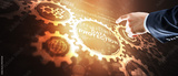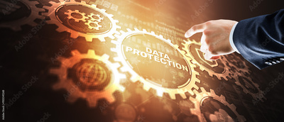 Data protection concept. Businessman pointing on virtual screen with text and icons 3D
