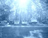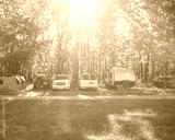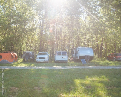 Portable solar panel at country campground with row of RV trailer, camper, truck, tent setup in Mansfield, Missouri, lush green trees, gravel road, spring meadow campsite, nature outdoor living