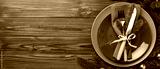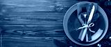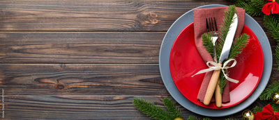 Christmas table place setting with christmas decor and plates, kine, fork and spoon. Christmas holiday background. Top view with copy space