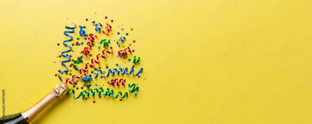 Creative flat lay composition with bottle of champagne and space for text on color background. Champagne bottle with colorful party streamers. holiday or christmas concept