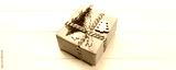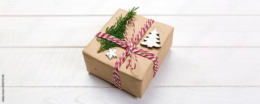 Christmas gift box wrapped in recycled paper, with ribbon top view with copy space on rustic background. Holiday concept