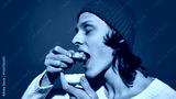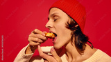 Young guy in red beanie hat enjoying donuts dipped in sweet sauce, set against bold red background. Ideal for street food and holiday market promotions. Concept of street food, winter, pop art