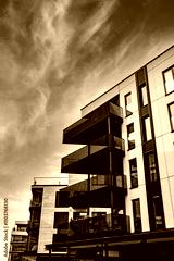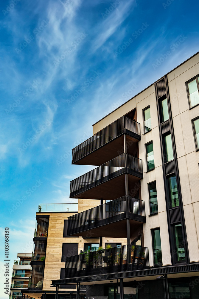 Modern Apartment Building with Glass Balconies and Industrial Elements.