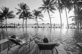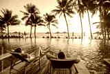 couple on holidays, beach vacation in luxury hotel near swimming pool at sunset