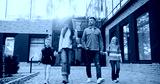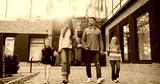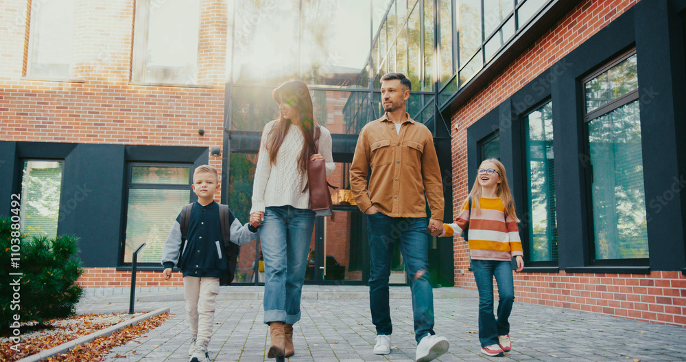 Front camera view of parents taking their kids from school. Caucasian man talking with woman while walking together in same direction. Children happy finishing difficult study day.