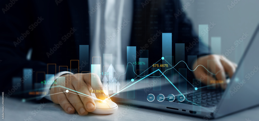 Business growth graph chart. Businessman analyzing sales data and financial report.Financial marketing graph grow chart. Arrow up with graph corporate future growth plan.