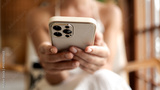 A young business woman is using applications on her mobile phone, reading the news or writing a message. Cellular communication, technology and business concept.
