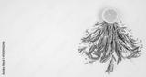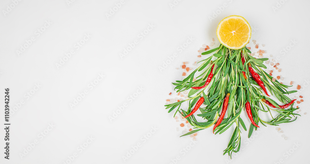 Christmas edible tree made from rosemary. Bunch of spices on white background. Cooking food concept. top view. copy space