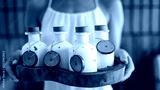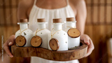 Woman's hands hold a tray with cosmetic products. Beauty, skin care and personal care concept showing elegance and skin care.