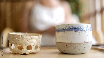 A young businesswoman enjoys tea during a break in a modern office lobby. A calm moment, perfect for concepts of work-life balance, productivity, and relaxation.