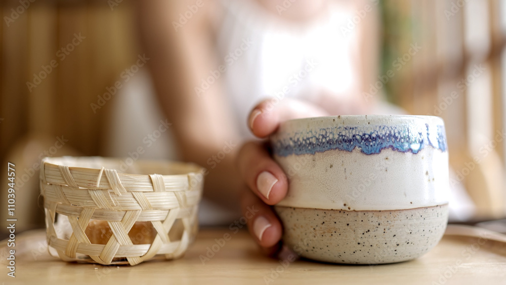 A young businesswoman enjoys tea during a break in a modern office lobby. A calm moment, perfect for concepts of work-life balance, productivity, and relaxation.
