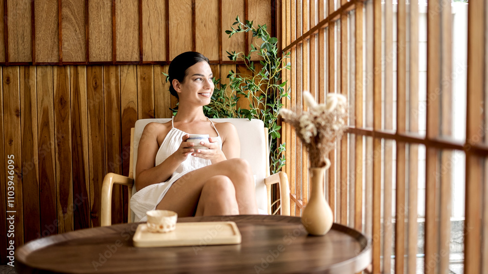 A young businesswoman enjoys tea during a break in a modern office lobby. A calm moment, perfect for concepts of work-life balance, productivity, and relaxation.