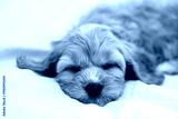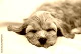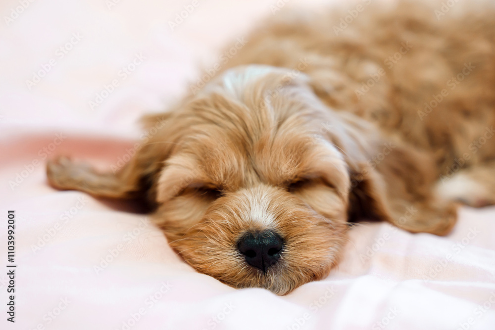 A puppy of a Cavapoo or Cockapoo breed dog at home. Baby Maltipu is sleeping on the bed.