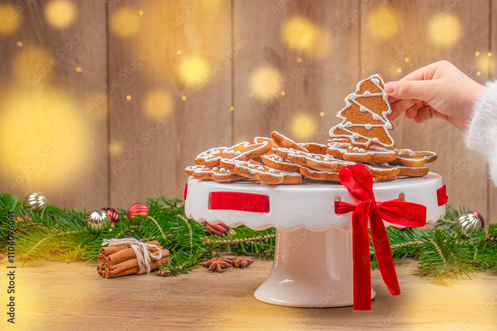 Christmas cookies, Children's Hands holding ginger Christmas tree cookie. Atmospheric Christmas holidays, family time, Copy space