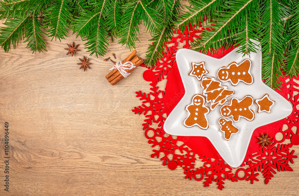 Christmas cookies on plate, fir branch on wooden table. Christmas baking. top view. copy space