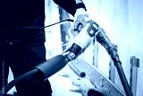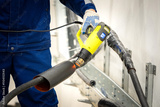 Hands of electrician with voltage wire. Cable joining. Installation insulation on electrical network. Using dryer for repairing voltage wires. XlPE electrical cable for installation inside building.
