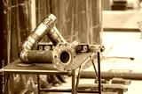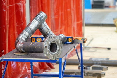Steel curved pipe on production table. Manufacturing complex elements for pipelines at factory. Metal pipe for boiler room. Fragment of pipeline in production workshop. Pipe for utility system