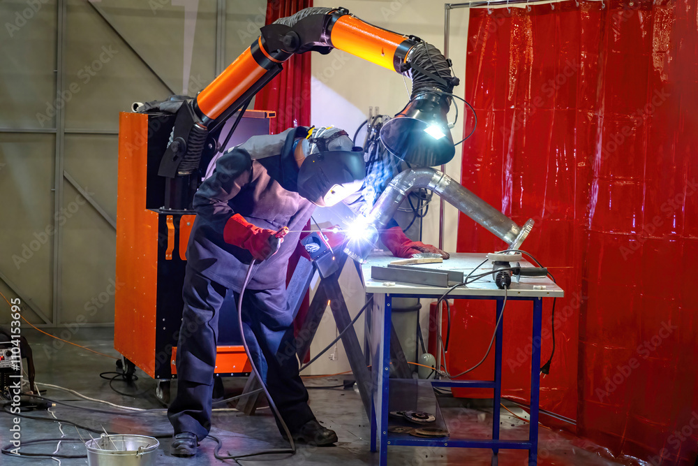 Welder work with professional equipment. Welding pipes at factory. Mask welder uses soldering machine. Pipe production at plant. Equipment for pumping out smoke near welder. Pipeline manufacturing
