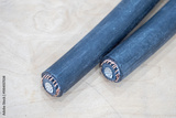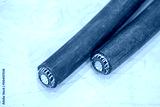 Sectional view copper cable. Two black wires on wooden surface. Cable for supplying equipment with electricity. Wires capable of operating under high loads. Copper cable with many thin cores inside