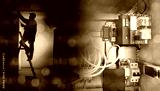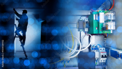 Electrical equipment repair. Electrical circuit breakers in power panel. Silhouette electrician standing on stepladder. Technician repairs high-voltage electrical equipment. Electrification premises