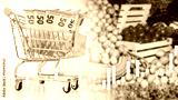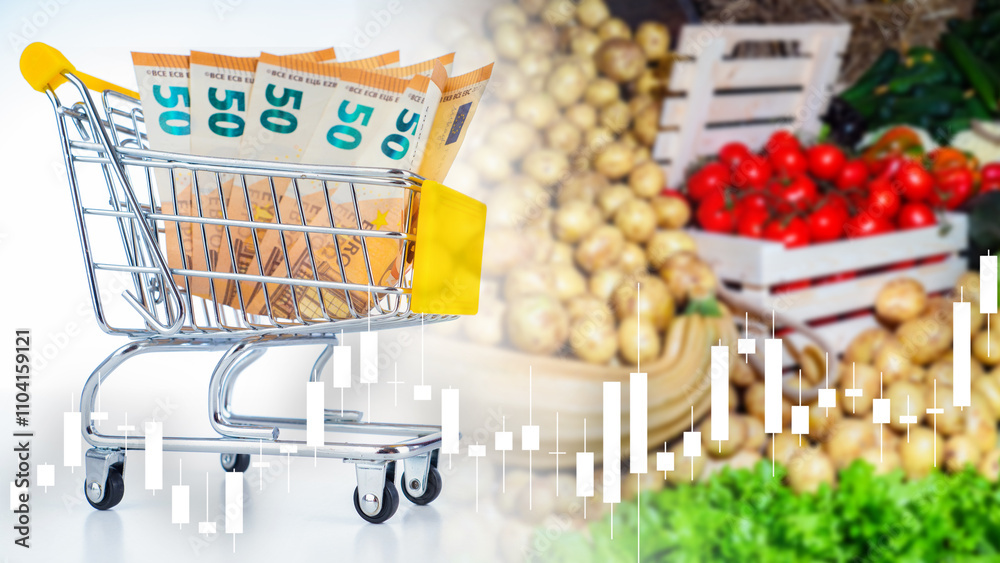 Trolley from grocery supermarket. Food inflation growth chart. Money in shopping cart. Increase in cost of fresh vegetables. Problem of food inflation. Changes in food prices. Grocery inflation