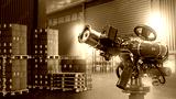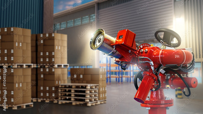 Stationary fire monitor. Fire fighting equipment in industrial zone. Red hydrant for extinguishing flames. Fire monitor near pallet with boxes. Warehouse security systems. Anti-burning equipment