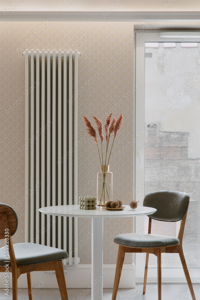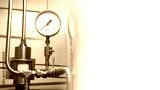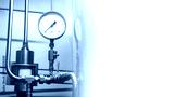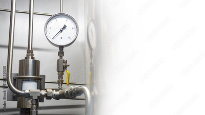 Gas boiler equipment. Thin steel tubes with pressure meter. Fragment of boiler equipment. Gas heating system. Equipment for supplying gas to apartment. Place for inscription on white