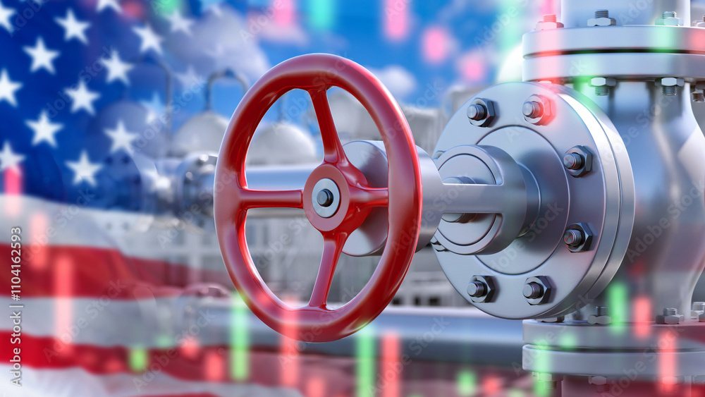 US energy industry with flag United States of America. Red valve on steel pipe. Pipeline on territory energy factory. Fragment gas pipeline with US flag. Import of energy resources to USA. 3d image