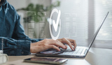 check, document, checklist, choice, guarantee, answer, assurance, certificate, choose, list. A man is typing on a laptop with a check mark on the screen. Concept of accomplishment and satisfaction.