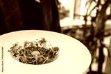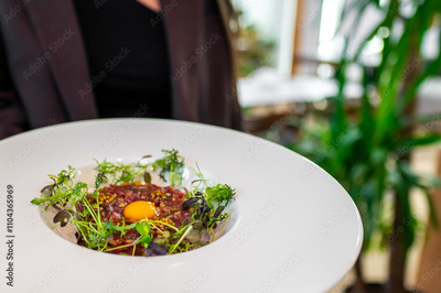 A gourmet dish featuring raw minced meat topped with a vibrant egg yolk and garnished with fresh microgreens, presented elegantly on a white plate in a stylish setting.