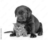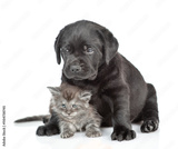 Black labrador puppy hugs tiny maine coon kitten. Pets look away on empty space together. Isolated on white background