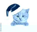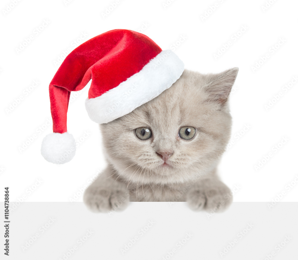 Cute tiny cat wearing red santa hat looking above blank white banner. isolated on white background