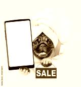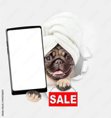 Cute Pug puppy with towel on it head holding big smartphone with white blank screen in it paw, looking through a hole in white paper and showing signboard with labeled "sale"